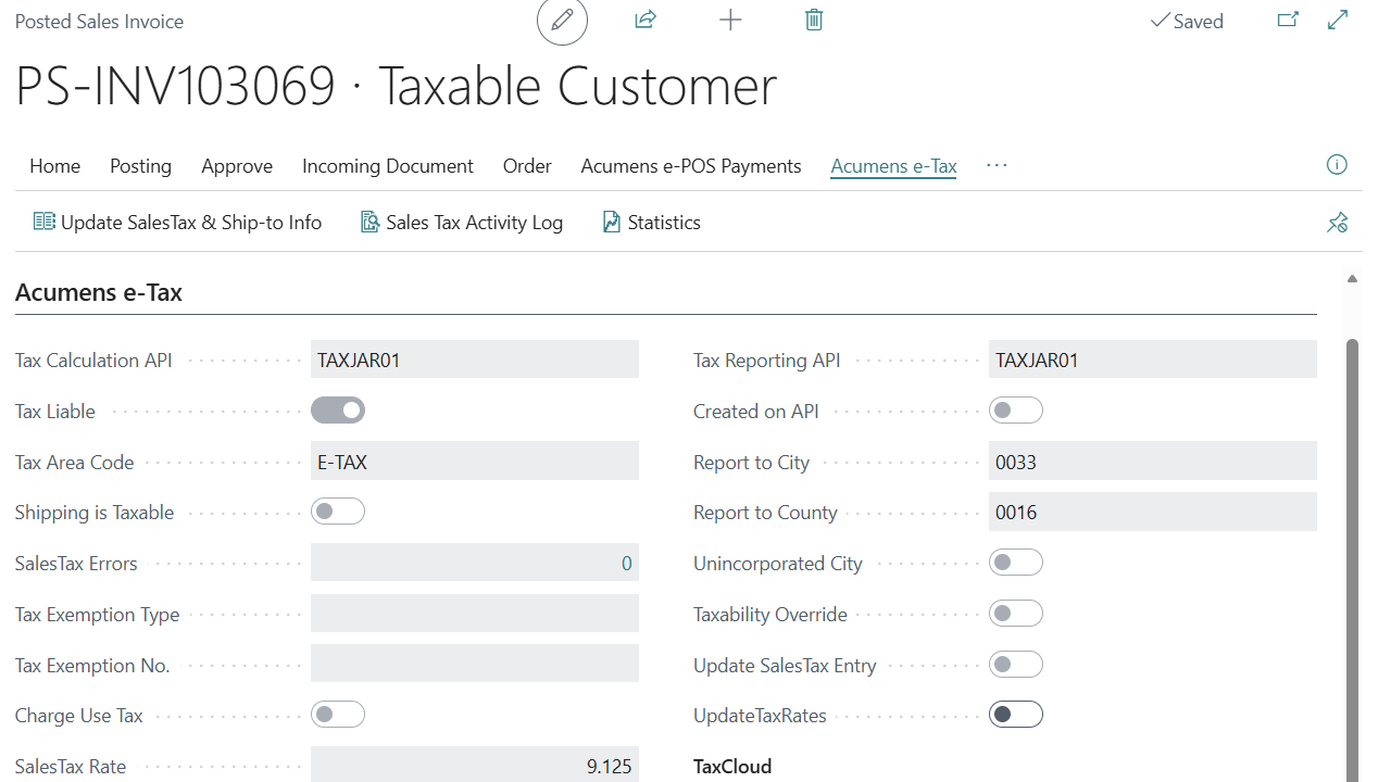 Posted Documents Sales Tax Related Updates: The App allows for Document Taxability and Ship-to / Return-from Address Updates. These changes trigger a recreation of the document sales tax entries for reporting. All these changes are logged.