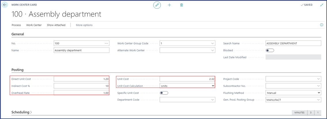The direct unit cost on the work or machine center is used to calculate Direct Labor Cost. The indirect cost % or overhead rate on the work or machine center is used to calculate Overhead Cost Applied.
