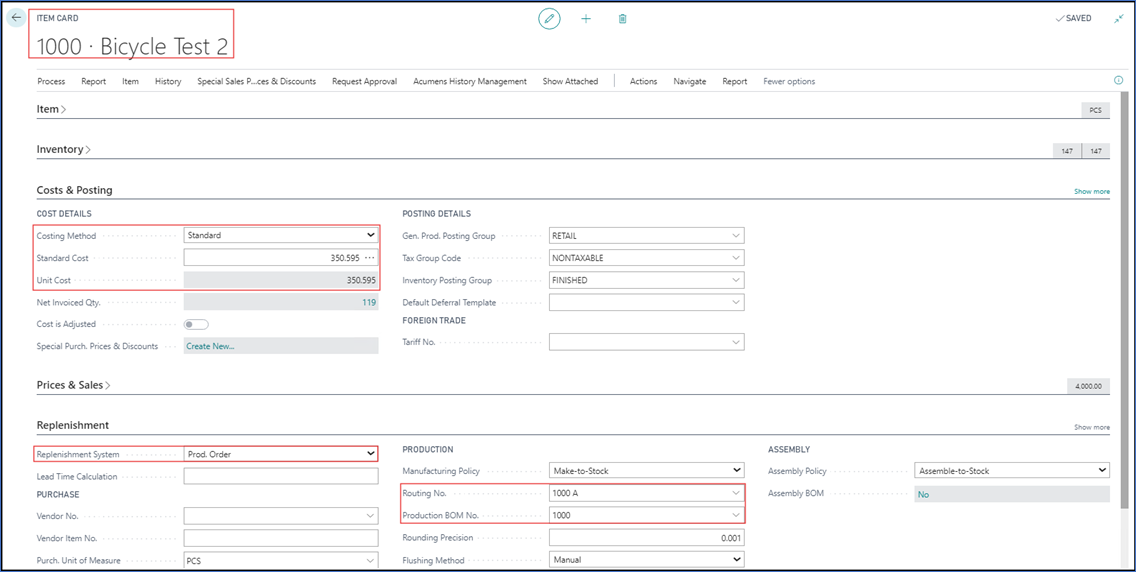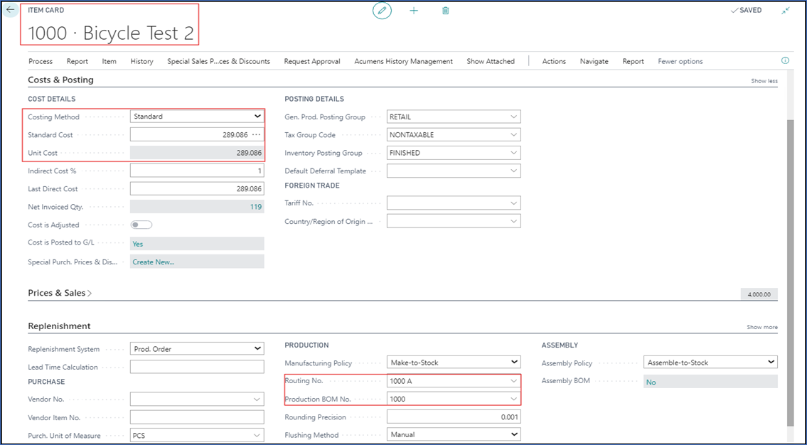 The Item is produced and consists of a BOM and a Routing. Item -> Costing Method is Standard.