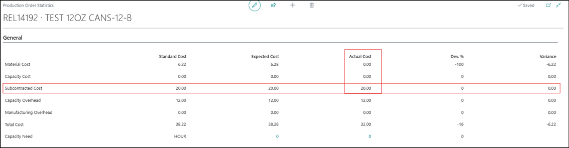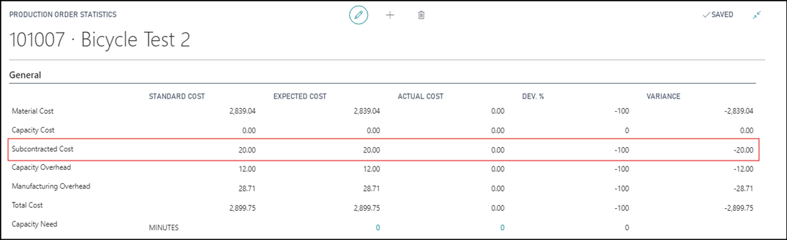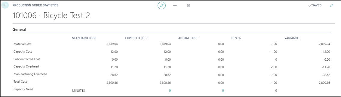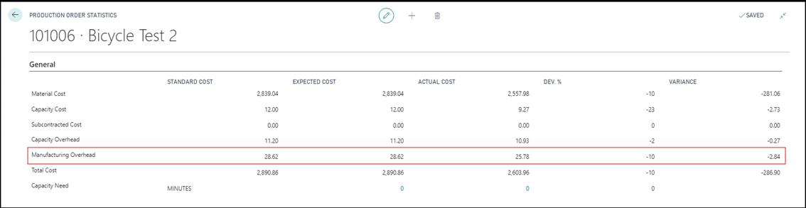 Actual Costs are posted to the production order and can be compared to the production order’s expected cost to see variance. If Item has Costing Method = Standard, then any variances will be posted to the general Ledger when the production order finishes.