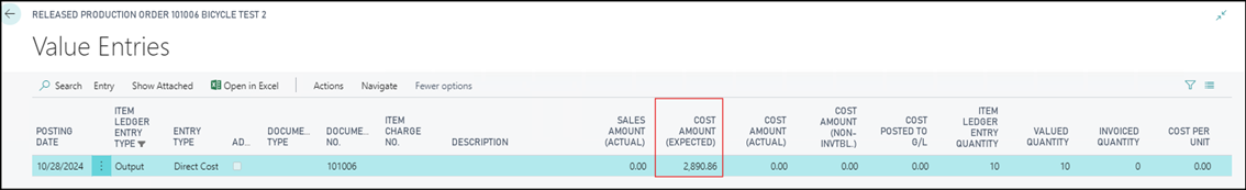 G/L Entry: A G/L entry is posted when Inventory Setup -> Expected Cost Posting is On. The unit cost from the item card is utilized for the expected output cost. G/L accounts are selected from the item's inventory posting group setup.