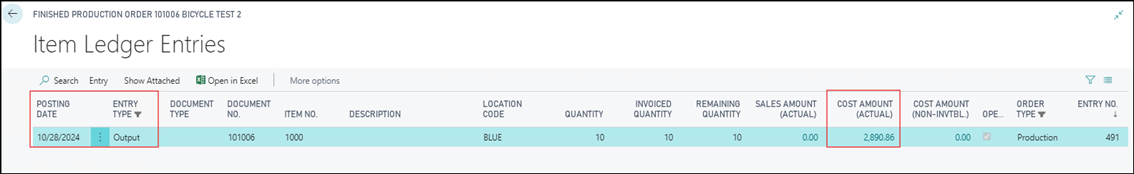Item Ledger Entry:An output item ledger entry is posted to add the finished goods item to inventory.